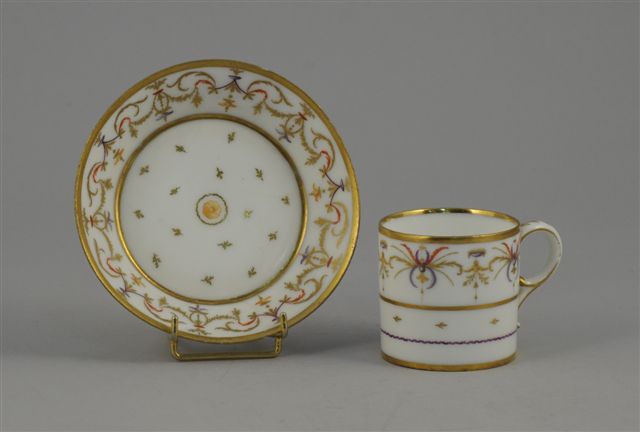 PARIS. Tasse et sous-tasse en porcelaine à décor de guirlandes feuillagées. Marquée "manufacture de M.gr le Duc d'Angoulême à Paris". (fêle et égrenures à la sous-tasse).