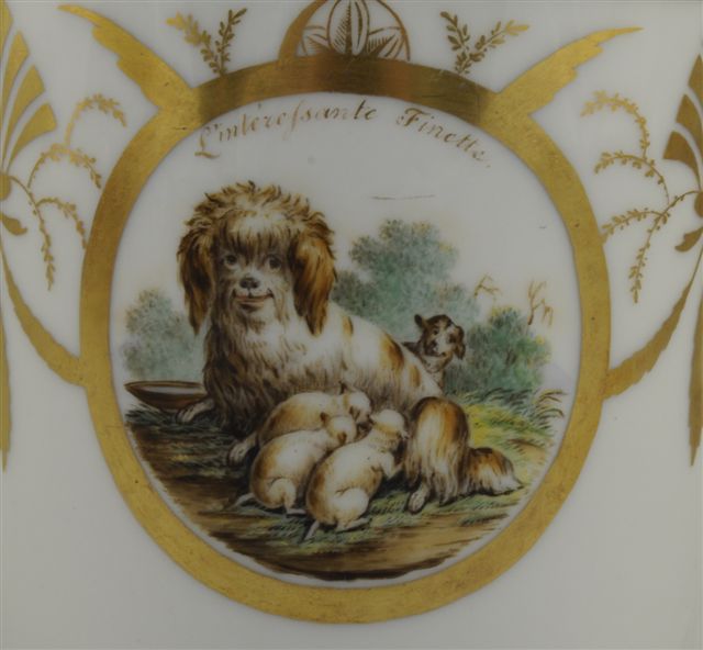 PARIS. VERSEUSE en porcelaine. Le corps cylindrique à décor or tournant de guirlandes agrémentée de motifs en rosace et palmette, orné, dans deux réserves ovales, sur une face, d'un rébus "Le [temps] passe et [l'ami] tié reste", et sur l'autre face, d'un décor polychrome représentant une chienne et ses petits "L'intérefsante Finette".