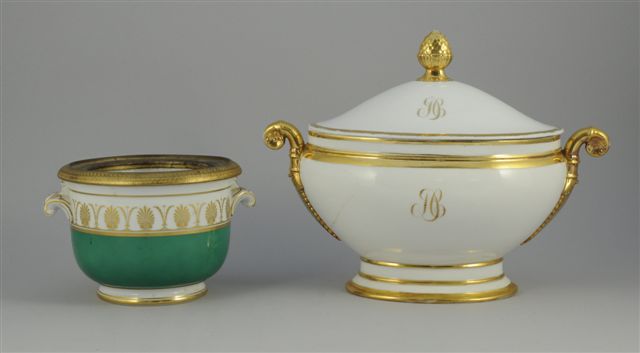 Joint. ITALIE. RICHARD GINORI. CACHE-POT en porcelaine sur léger piédouche. Fond vert. Orné d'une large frise de palmettes or. Anses latérales en volutes feuillagées. Bordure en laiton doré solidaire d'une doublure en métal. Style Restauration. Haut. 14, Diam. 20 cm (petit choc à la monture)