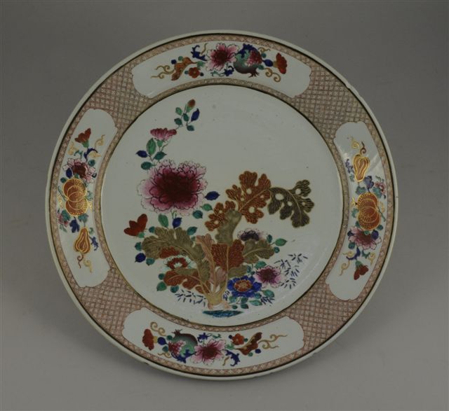 CHINE. Grand PLAT ROND en porcelaine polychrome et or - à décor central de pivoines et de fleurs, l'aile ornée de quatre réserves fleuries de grenades - sur un fond de croisillons. Dans le goût de la Compagnie des Indes, XIXème. Diam. 48,5 cm. (petites égrenures).