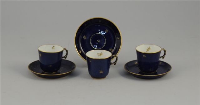 SÈVRES. LOT composé de deux TASSES et trois SOUS TASSES en porcelaine à fond bleu décor or de fleurettes en semi. Les tasses marquées S 1907 et S 1914, les sous-tasses marquées S 96 et S 1914.