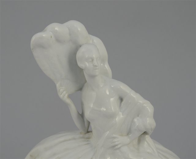 Élégante à l'éventail. Porcelaine. Signée en creux et marque aux flèches croisées en bleu "29"