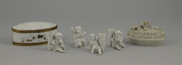 VARIA. LOT comprenant une série de quatre AMOURS au carquois de flèches formant petits vases en biscuit, deux BONBONNIERES ovales en porcelaine, l'une en biscuit à décor floral appliqué en relief, l'autre à monture en laiton doré (petits accidents et manques)