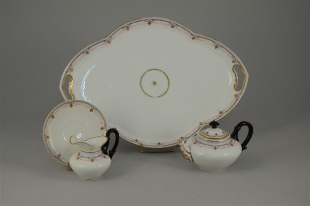 VARIA. Partie de SERVICE à THÉ en porcelaine comprenant un PLATEAU polylobé, une THÉIÈRE, un POT à LAIT, une SOUS-TASSE. Napoléon III, XIXème. (accidents).