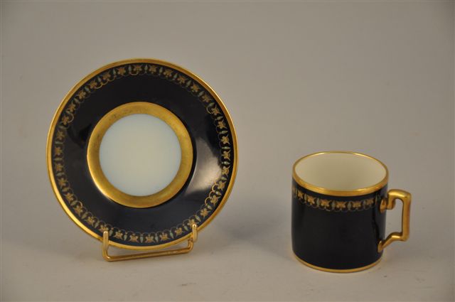 VARIA. TASSE et sa sous-tasse en porcelaine, de forme litron à décor à l'or et émaillé d'une frise de fleurs de lotus, sur fond bleu de four dans le goût de Sèvres. Filets et anse or. Marque en vert "J" sur étoile. Haut. de la tasse: 5 cm. Diam de la sous tasse: 10,5 cm.