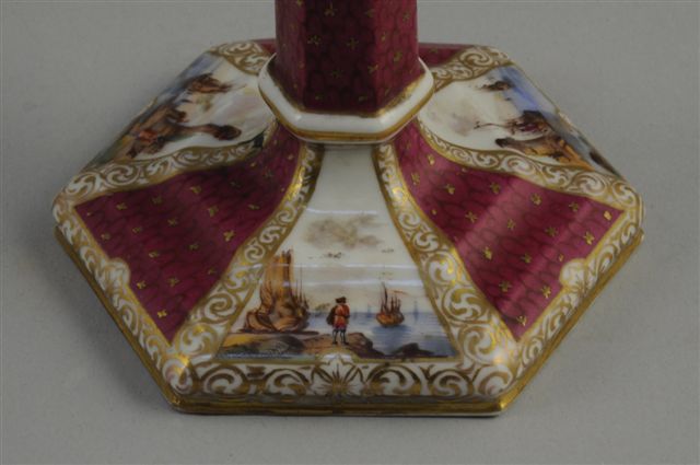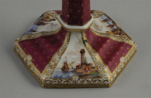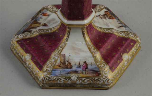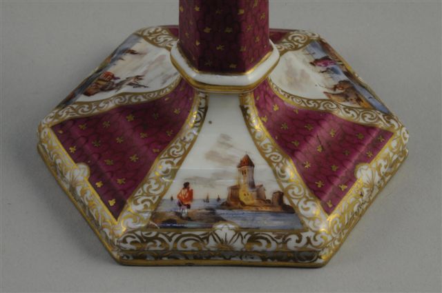 BERLIN (?). PAIRE DE CHANDELIERS hexagonaux en porcelaine à décors de semi de fleurs de lys dorées sur une réserve violette et de scènes de ports dans des encadrement de rinceaux à l'or ; marque au sceptre non souligné à l'encre bleue.