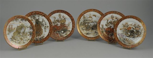 CHINE. Suite de 6 ASSIETTES en porcelaine à décor polychrome et or de grues, cailles, paons... Aile à fond vermiculé or. Revers de l'aile à décor floral. Fin XIXème. Diam. 19,5 cm.(fêle à l'une)