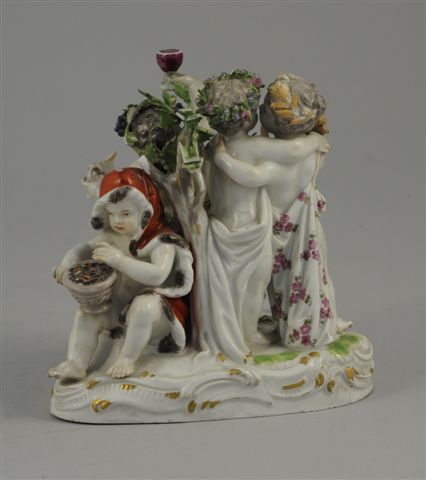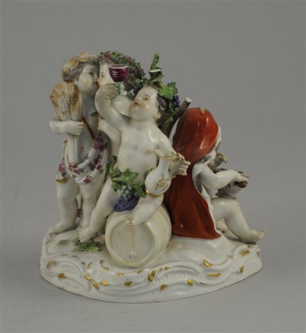 MEISSEN. GROUPE en porcelaine polychrome et or représentant quatre putti en Bacchus, Cérès,... sur terrasse mouvementée. Marque en bleu sous couverte aux épées croisées. Haut. 15 cm (accidents et manques)