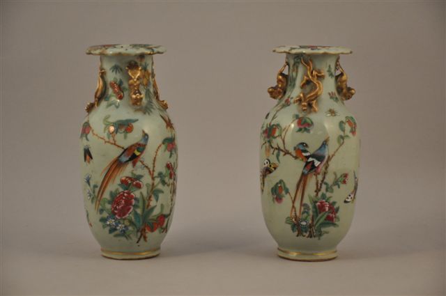 CHINE. Paire de VASES en grès porcelaineux à couverte céladon à décor tournant polychrome émaillé de fleurs, d'oiseaux et de papillons. Col orné de lézards et chiens de Fô dorés. Dans le goût de la Compagnie des Indes. XIXème. Haut. 24,5 cm (fêles et accidents)