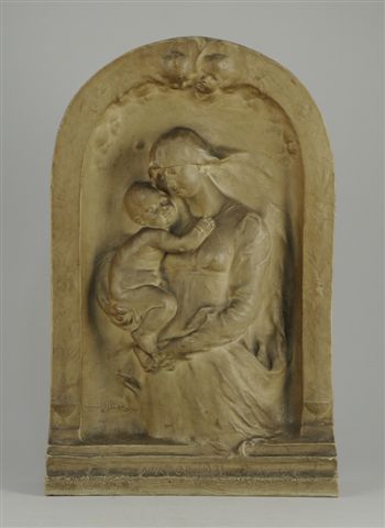 VARIA. Jeanne ITASSE (? - 1867). LA VIERGE ET LE CHRIST. Sculpture en grès reprenant la forme d'un autel de dévotion orné de vases fleuris et d'angelots. Porte sur le socle les inscriptions manuscrites en creux "Mater Dei" / "Grés Emile Muller". Au revers, un cachet rond en creux "Emile Muller" avec la marque "Ivry" et "reproduction interdite". Milieu du XIXème siècle. Haut. 48,5, Larg. 31 cm.