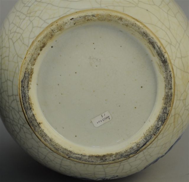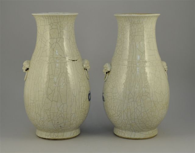PAIRE de VASES en porcelaine émaillée beige craquelée à décor en bleu sous couverte de personnages. CHINE, Nankin, XIXème. Haut. 47 cm (accidents et restaurations).