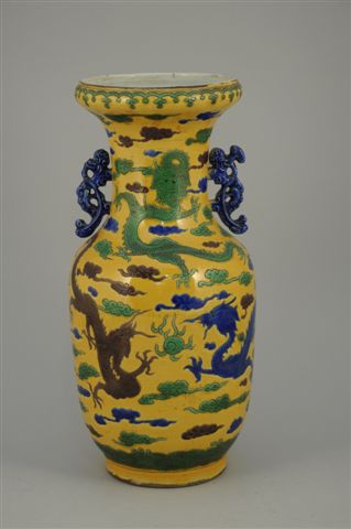 CHINE. VASE de forme balustre en porcelaine émaillé polychrome à décor de deux dragons pourchassant la perle sacrée sur fond jaune. Deux anses en forme de qilong stylisés.