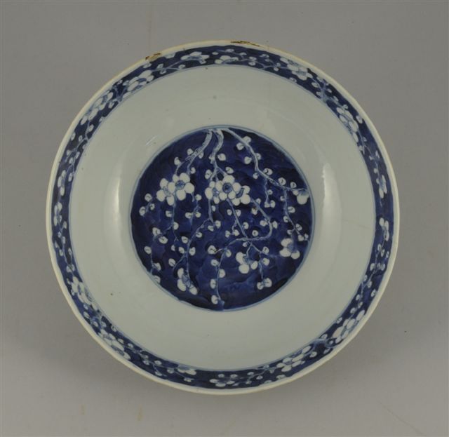 CHINE. XIXème. BOL en porcelaine bleu et blanc à décor de pruniers enfleurs.