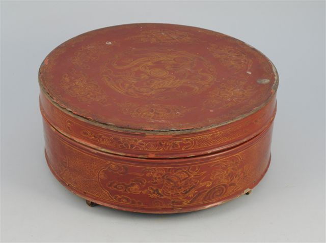 Grande BOITE circulaire en laque, reposant sur quatre pieds. Décor tournant sur le corps et le couvercle de phénix et nuages dans des réserves.