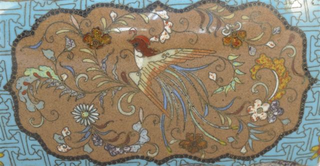 JARDINIÈRE en émail cloisonné de forme galbée. Décor dans des réserves de papillons, oiseau et fleurs, sur fond turquoise et parme.
