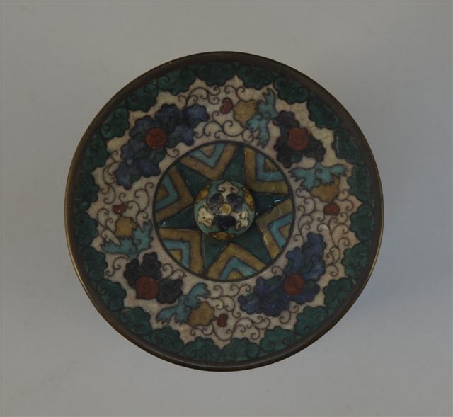 POT couvert de forme cylindrique en cuivre et émaux cloisonnés à décor de médaillons de kilin et phénix. Chine, fin XIXe.