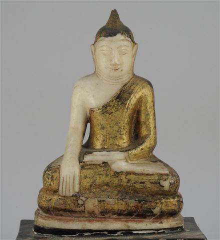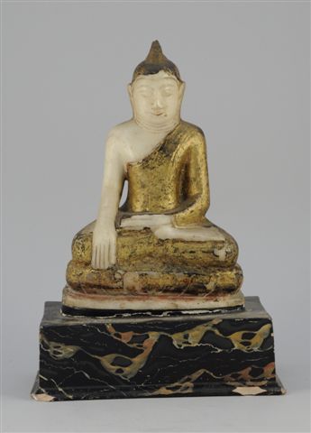 BOUDDHA en albâtre sculpté partiellement recouvert de laque or. Rapporté sur socle en terre cuite peinte à l'imitation du marbre. Birmanie, XIXe/XXe