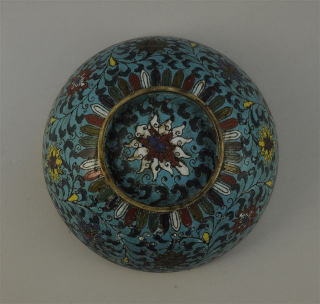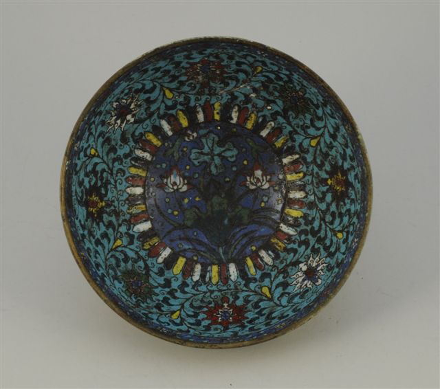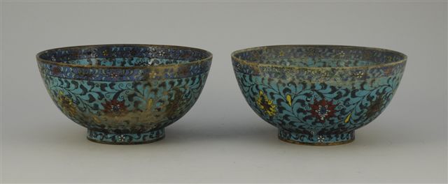 Paire de bols en bronze et émaux cloisonnés à décor de lotus et rinceaux sur fond bleu turquoise. Chine, époque Ming, XVIIe.