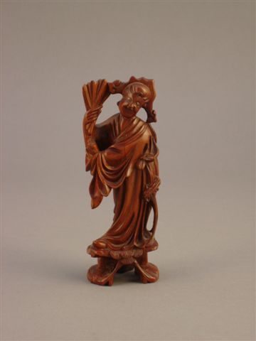 STATUETTE de jeune femme debout tenant un éventail en bois. Chine. Haut. 15 cm.