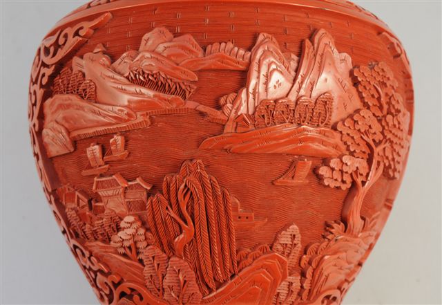 VASE dans le genre laque de Pékin. Décor de paysages. Intérieur en émail bleu. Haut. 32 cm.