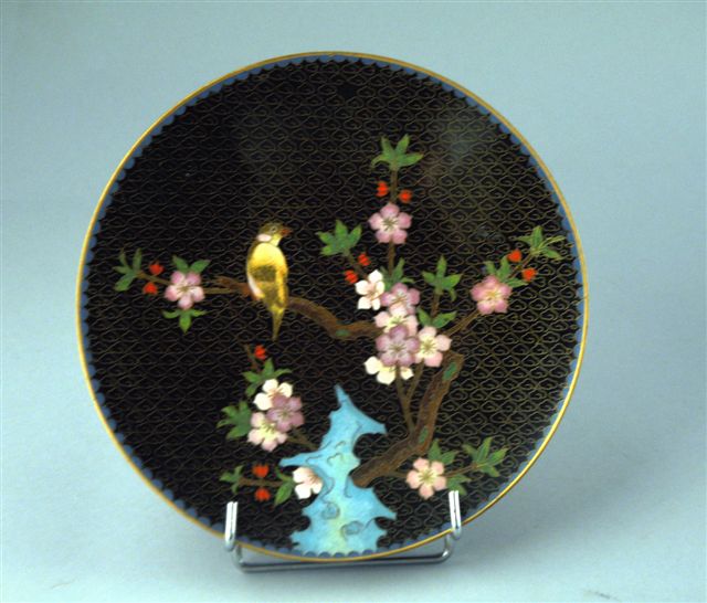 Deux ASSIETTES RONDES en émaux cloisonnés, à décor multicolore d'oiseau branché.
