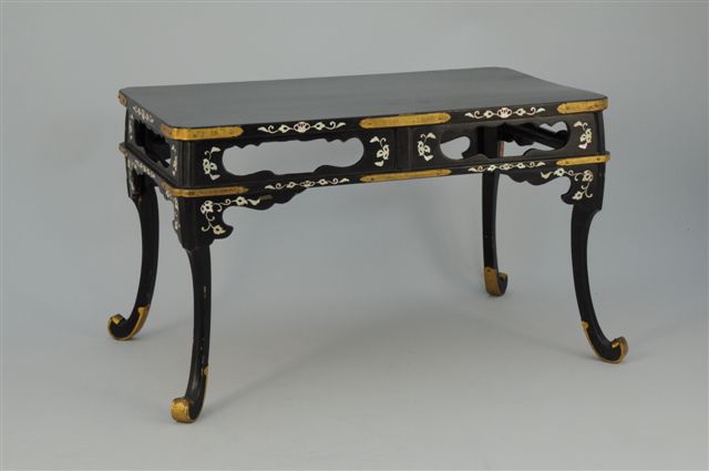 Petite TABLE en laque noir. Elle repose sur quatre pieds galbés. Décor incrusté de nacre. Garniture de laiton doré gravé aux angles et aux pieds. Haut. 26,5, Long. 43, Larg. 24 cm