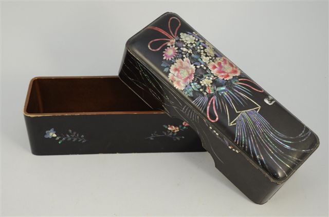 BOITE en laque à décor peint et incrusté de nacre représentant un bouquet de pivoines. Couvercle à échancrures polylobées latérales. Intérieur en laque pailletée or.