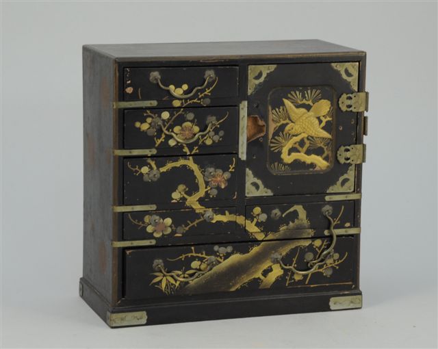 Petit CABINET en laque. Fin XIXème. Haut. 20,5, Larg. 20,5, Prof. 10 cm (accidents et manques)