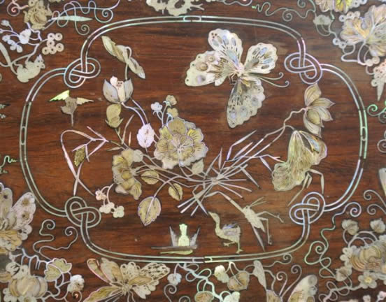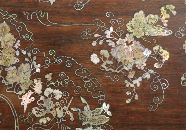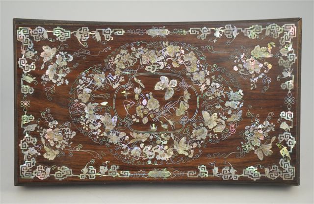 COFFRET en palissandre. Fin décor incrusté toutes faces, de nacre gravée: fleurs, papillons. Indochine (?). Haut. 16, Long. 35, Larg. 20,5 cm. (petits accidents et manques)