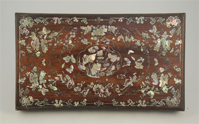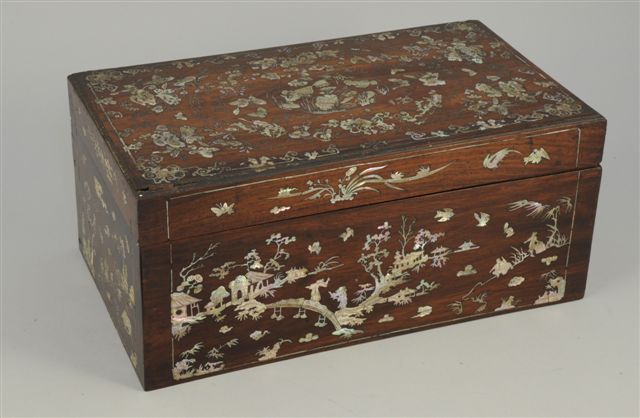COFFRET en palissandre. Fin décor incrusté toutes faces, de nacre gravée: canards, fleurs et paysages. Indochine (?). Haut. 17, Long. 38, Larg. 32 cm (petits accidents et manques)
