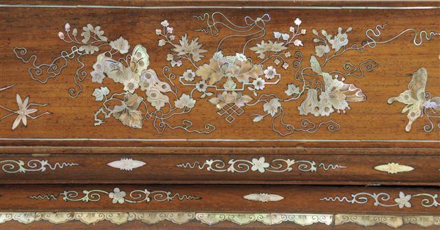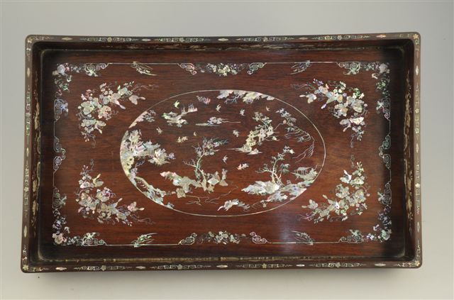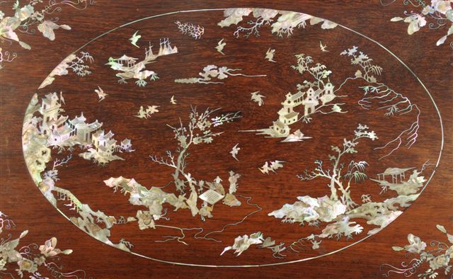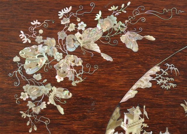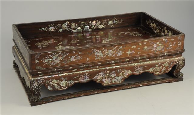 TABLE à THÉ rectangulaire en palissandre, composée d'un plateau mobile sur piètement. Fin décor incrusté toutes faces, de nacre gravée: paysages, fleurs et papillons. Indochine (?). Haut. 20, Long. 62,5, Larg. 37 cm.