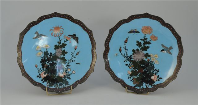 DEUX PLATS en bronze et émaux cloisonnés à décor de pivoines dans leur feuillage, oiseaux et papillons. Japon, vers 1900.