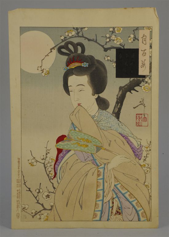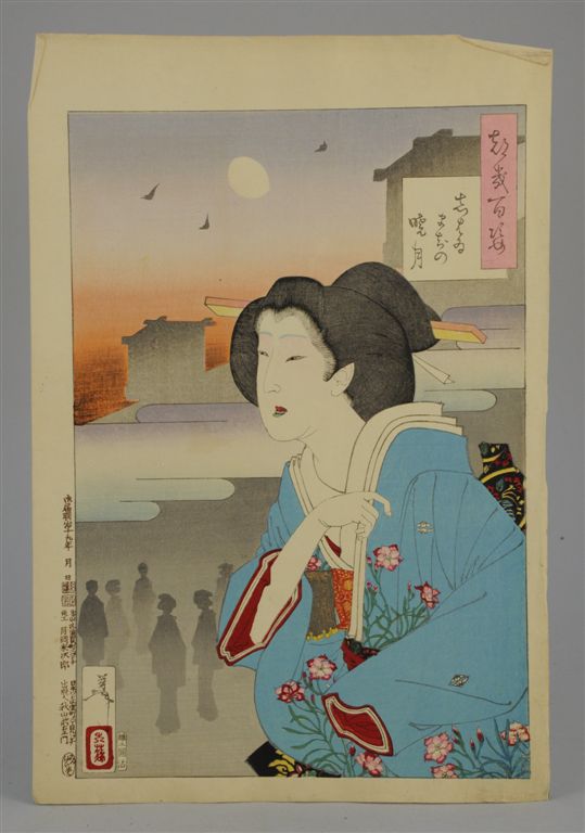 Yoshitoshi: Ensemble de 15 oban tate-e de la série "Tsuki hyakushi", les cent aspects de la lune. Signé Yoshitoshi ga. (Taches, légères accidents).