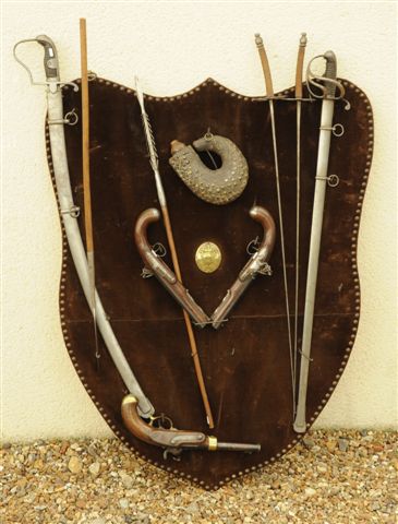 PANOPLIE présumée d'Alexandre Jules de LA ROCHEFOUCAULD duc dEstissac (17961856). Elle comprend: deux pistolets à silex, un pistolet à capsule (SUHL), une poire à poudre en corne, deux sagaies, deux sabres (KLIGENTHAL, SOLINGEN), deux fleurets (SOLINGEN, un marqué "Jules") et une plaque métallique (Époque RESTAURATION).