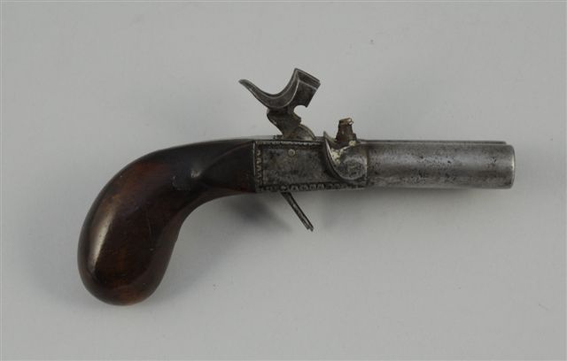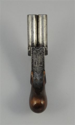 PISTOLET à percussion de gousset, à coffre en partie gravé, 2 canons juxtaposés, double détente escamotable, crosse en en noyer. Louis-Philippe. Long. totale: 14 cm.