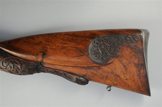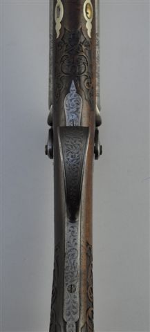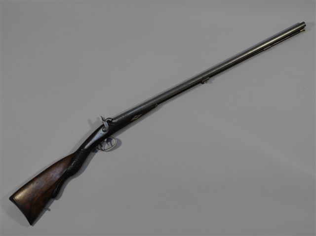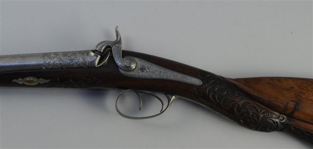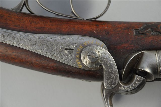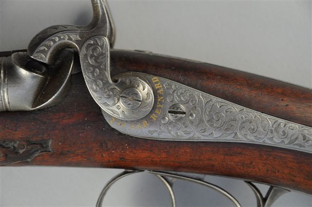 FUSIL de CHASSE calibre 20 (?), 2 canons juxtaposés en damas, double détente, platine à percussion dîte à la Poncharra, nombreuses gravures, crosse anglaise en noyer ronceux, avec baguette. Signé sur la platine en lettre d'or "F NI PAR REYNARD / A CLAMECY".