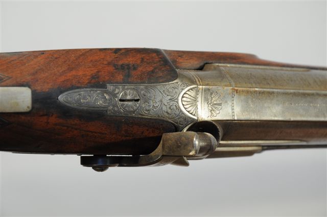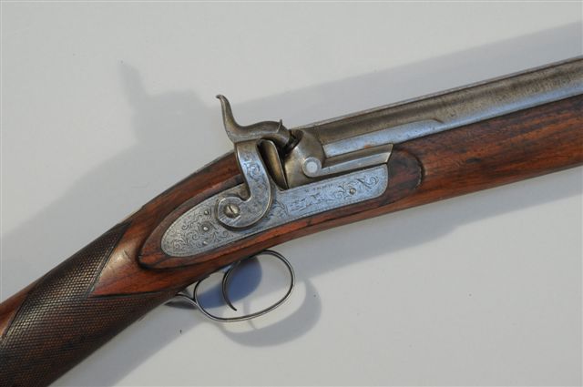 FUSIL de CHASSE à percussion, 1 coup, canon Damas (?), finement ciselé: queue de culasse, platine, pontet, crosse anglaise quadrillée en noyer. Signé W. SMITH PRINCES STt LONDON".