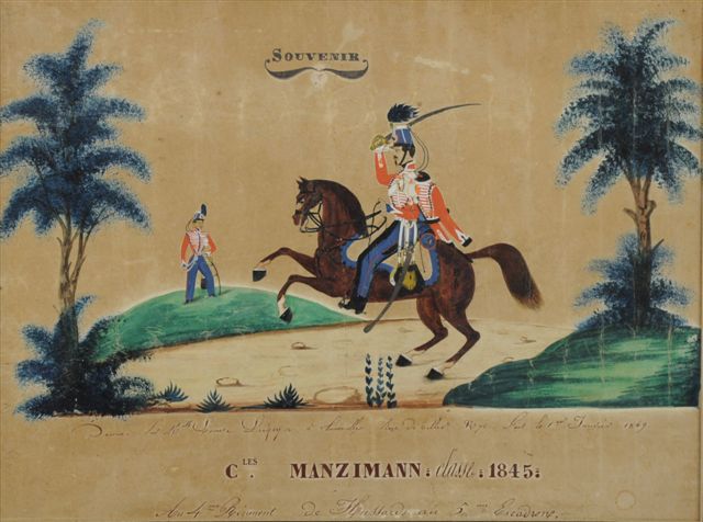 PORTRAIT EQUESTRE-SOUVENIR. Cles MANZIMANN, classe 1845, au 4ème régiment de Hussards au 5ème escadron. "Dessiné par Melle Louise Liégey à Lunéville, rue de Villes, n. 72, fais le 1er janvier 1849".