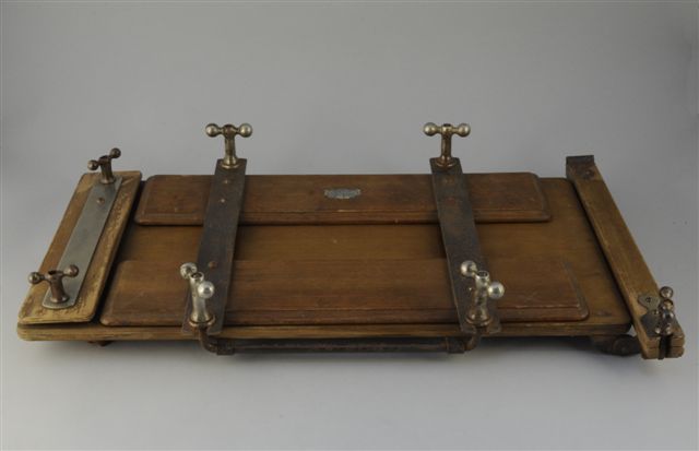 PRESSE à mise en forme des pantalons d'uniformes en bois et métal "Trouser's press with strecher". Maison WATTS TRIUMPH. Fin XIXème. Haut. 13, Long. 75, Larg. 44 cm.