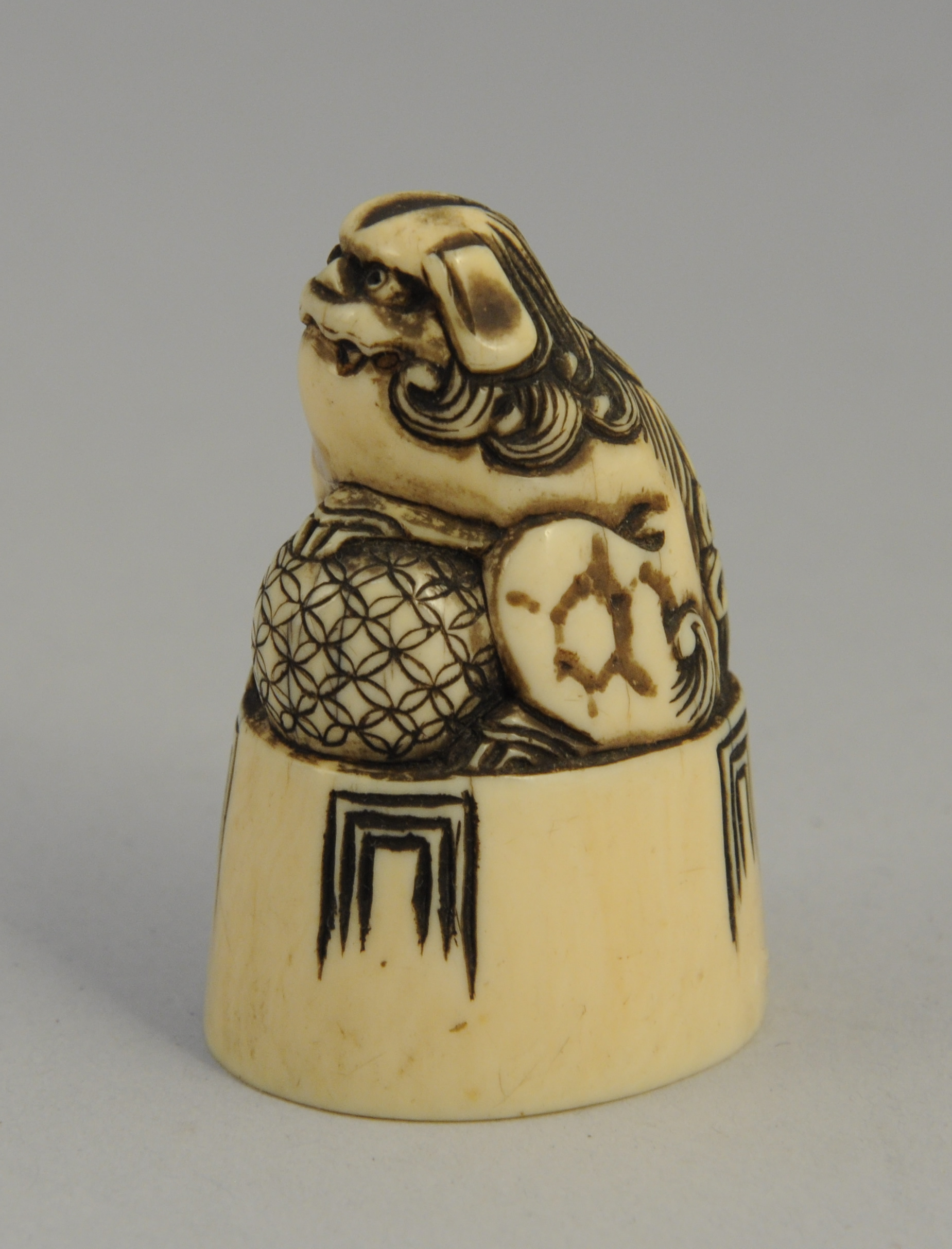 NETSUKE CACHET ovale en ivoire sculpté d'un chien de Fô et TABATIÈRE en ivoire en forme de livre. Haut. respectives: 4,5 et 4 x 2,5 cm. Joint: TABATIÈRE en verre ou pierre dure (?) sculptée. Haut. 5,5 cm.