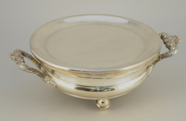 CHAUFFE-PLAT circulaire en métal argenté, les anses à décor fleuri de feuilles d'acanthe, reposant sur des pieds boules. Dessus rapporté?.