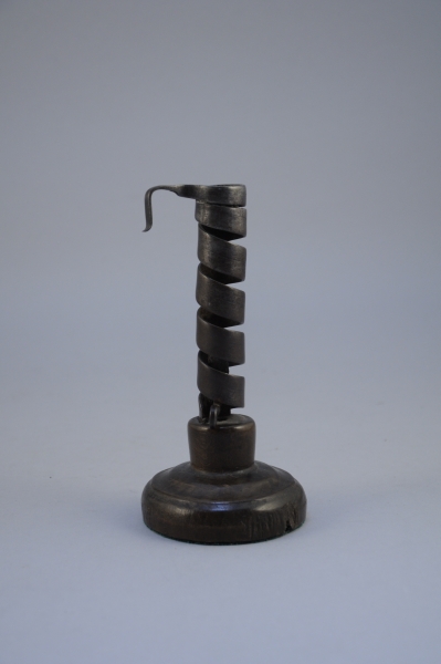 BOUGEOIR dit "rat-de-cave" en spirale de fer forgé et socle de bois.