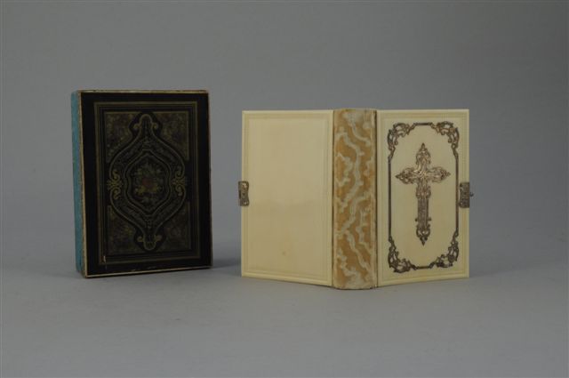MISSEL. Les plats en ivoire, sculpté d'une rang de perles en bordure. Le premier plat appliqué en incrustation d'une croix et d'un encadrement, en argent gravé. Dos en velours de soie frappé de couleur ivoire. Fermoir en argent gravé. Tranche dorée. Planches gravées en couleur. Étui en cartonnage.