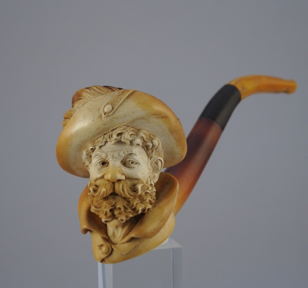 PIPE en écume de mer sculptée à décor d'une de tête de marin coiffé d'un chapeau à plumes. Inscrit "J. Sommier Paris. Aux Carrières d'écume. Médaille d'or 1878." dans l'écrin.
