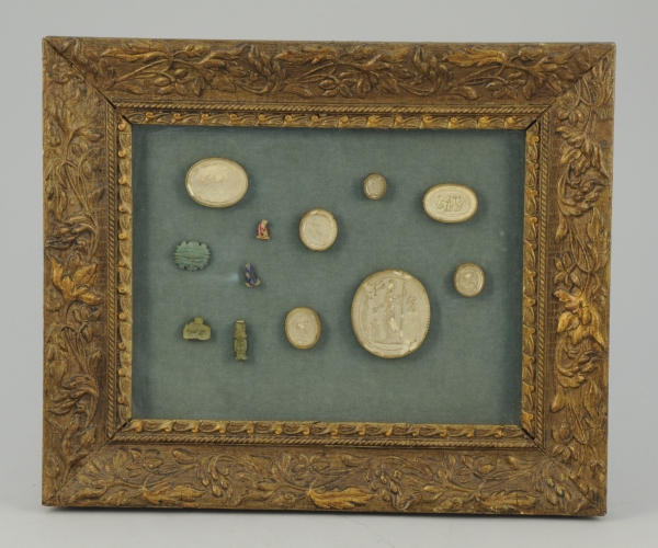 Ensemble de sept CACHETS en plâtre patiné ayant pour matrice des intailles ovales, trois éléments anciens en fritte (Egypte?) et deux personnages assis en grès, probablement Chine. (accidents). Présenté dans un cadre. 18,5 x 24 cm (vue)