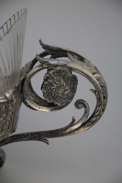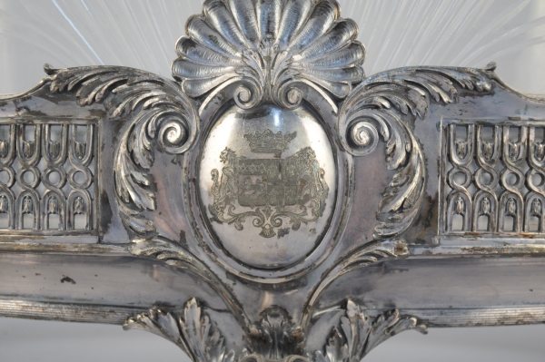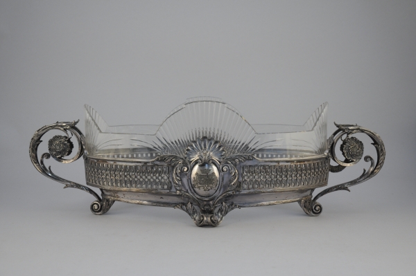 JARDINIÈRE en métal argenté à décor ajouré de postes et d'un cartouche à coquille armorié. Les anses en volutes à décor de feuilles d'acanthe. Repose sur des pieds à enroulements et motifs d'acanthes. Intérieur en verre.