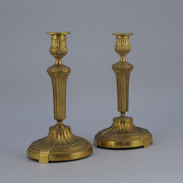 PAIRE de FLAMBEAUX en bronze ciselé et redoré à décor de rangs de perles et frise de fleurs; le socle circulaire et le fût, sur piédouche, cannelés, la bobèche à décor de fleurs de lotus.