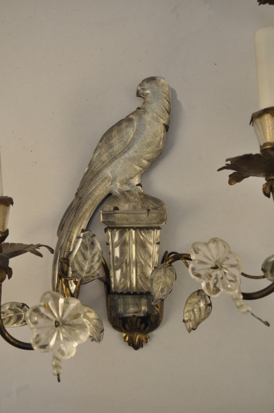Paire d'appliques en métal doré et verre à deux bras de lumières agrémentés de branchages fleuris, le fût figurant un perroquet sur une gaine.