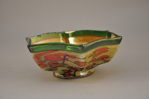 COUPE en verre de forme hexagonale à décor vert, orange et reflets métalliques.