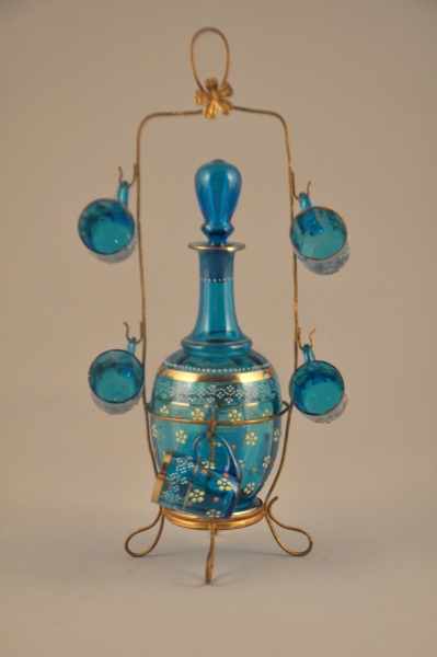 CABARET en verre teinté bleu réhaussé de filets d'or et de goutte d'émail opaque jaune blanc et rouge formant des fleurs, comprenant un flacon fermé et six verres réunis sur un support de fils métalliques doré.
